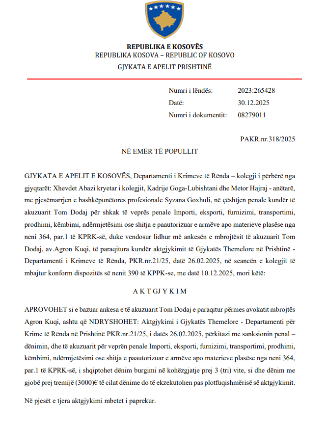 Sipas vendimit të Apelit që është marrë më 30 dhjetor 2025, Dodaj është dënuar me burgim në kohëzgjatje prej 3 vjetësh dhe me një gjobë prej 3,000 euro, të cilat do të ekzekutohen pas plotfuqishmërisë së aktgjykimit.