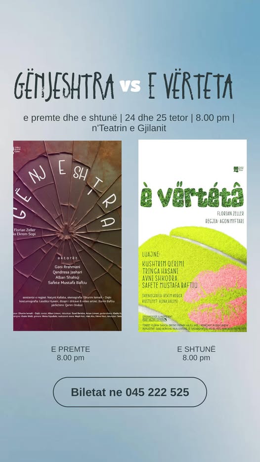 Skena e Teatrit të Gjilanit, sot dhe nesër nga ora 20:00, kthehet në një fushë loje mes gënjeshtrës dhe së vërtetës me dy komeditë e Florian Zeller – “Gënjeshtra” dhe “E Vërteta”.