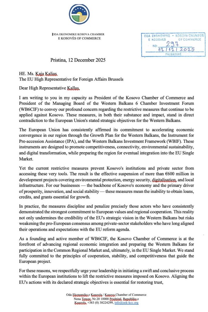 Kryetari i Odës Ekonomike të Kosovës, Lulzim Rafuna, ka ngritur shqetësime të mëdha për ndikimin e masave kufizuese që mbeten në fuqi ndaj Kosovës, duke i drejtuar një letër Znj. Kaja Kallas, Përfaqësuese e Lartë e Bashkimit Evropian për Çështjet e Jashtme.