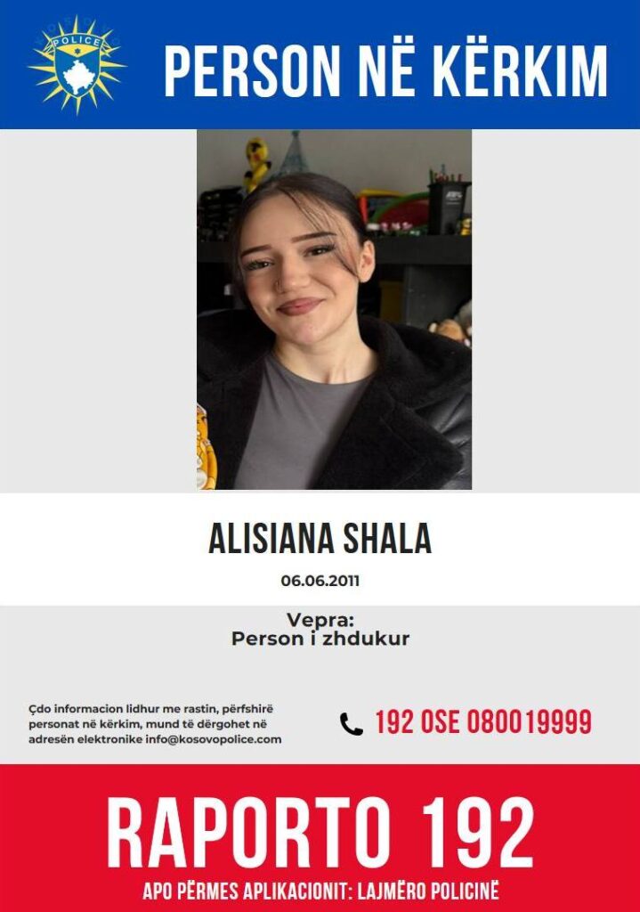 Drejtoria Rajonale e Policisë në Gjakovë ka bërë apel për ndihmën e qytetarëve në lidhje me zhdukjen e një vajze të mitur, Alisiana Shala, rreth 14 vjeç, nga komuna e Rahovecit.