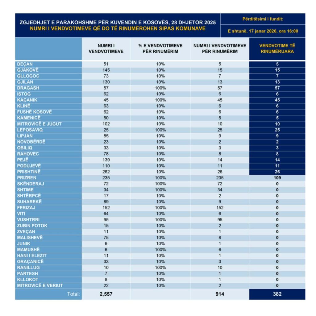 Sipas të dhënave zyrtare, nga nisja e procesit të martën, më 13 janar 2026 në orën 18:00, e deri të shtunën, më 17 janar 2026 në orën 16:00, janë rinumëruar gjithsej 382 nga 914 vendvotime. Këto vendvotime u përkasin komunave: Deçan (5/5), Gjakovë (15/15), Gllogoc (7/7), Gjilan (13/13), Dragash (57/57), Istog (6/6), Kaçanik (45/45), Klinë (6/6), Fushë Kosovë (6/6), Kamenicë (5/5), Mitrovicë e Jugut (10/10), Leposaviq (25/25), Lipjan (9/9), Novobërdë (2/2), Obiliq (3/3), Rahovec (8/8), Pejë (14/14), Podujevë (11), Prishtinë (26/26) dhe Prizren (109/235).